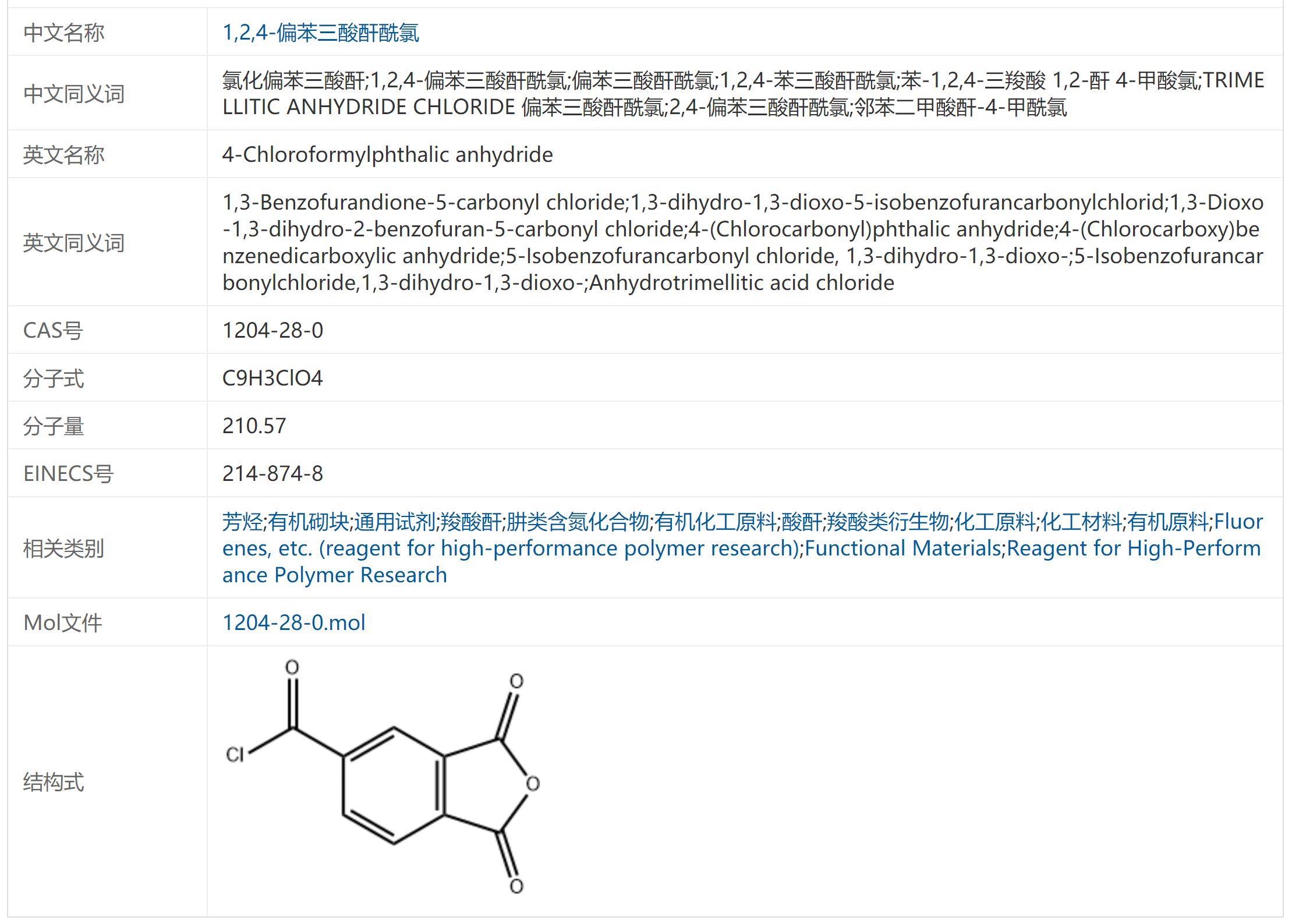 1,2,4-偏苯三酸酐酰氯 1204-28-0 含量99% 羧酸衍生物 有机金属试剂