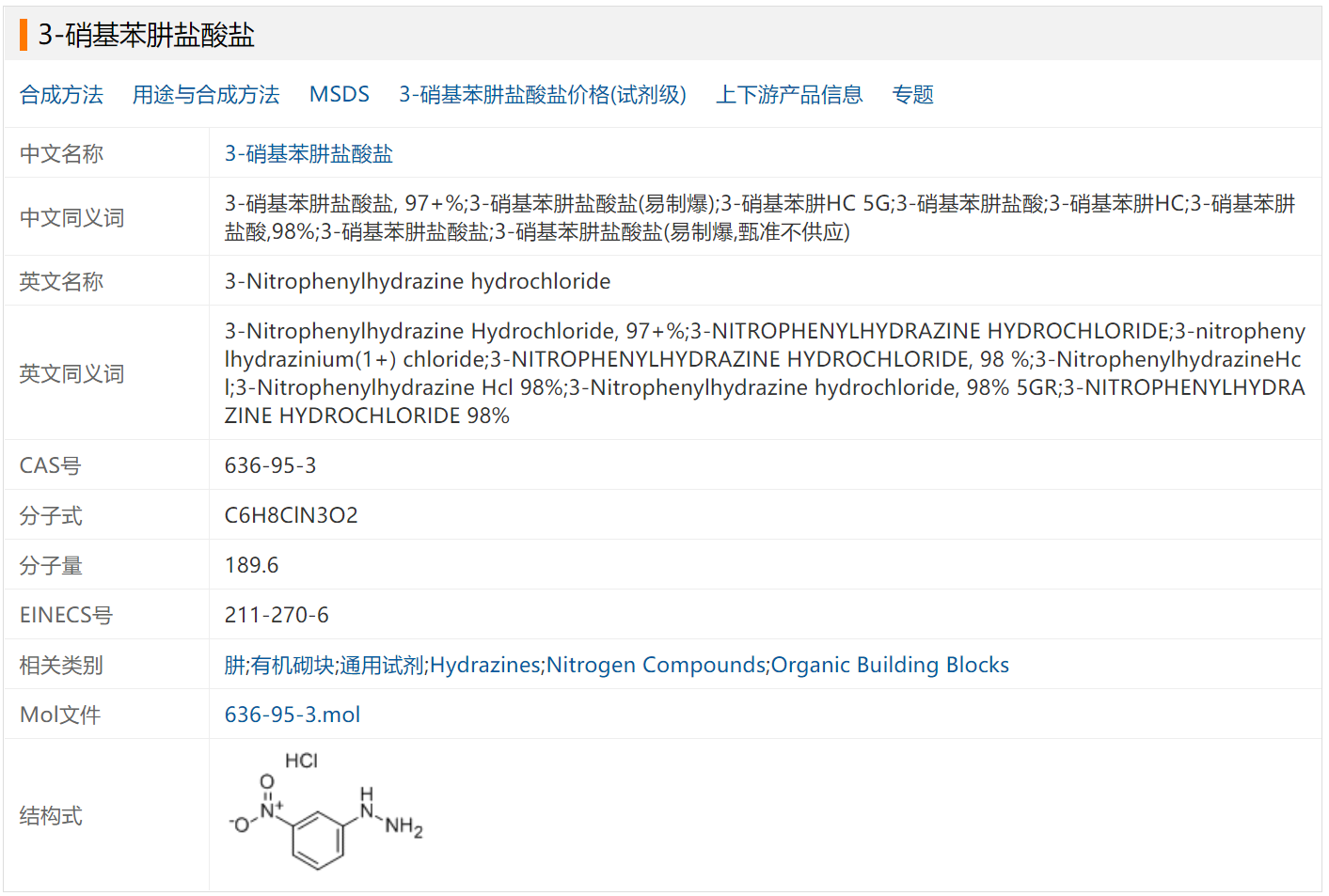 3-硝基苯肼盐酸盐 636-95-3 含量98% 芳香类有机化合物 试剂材料