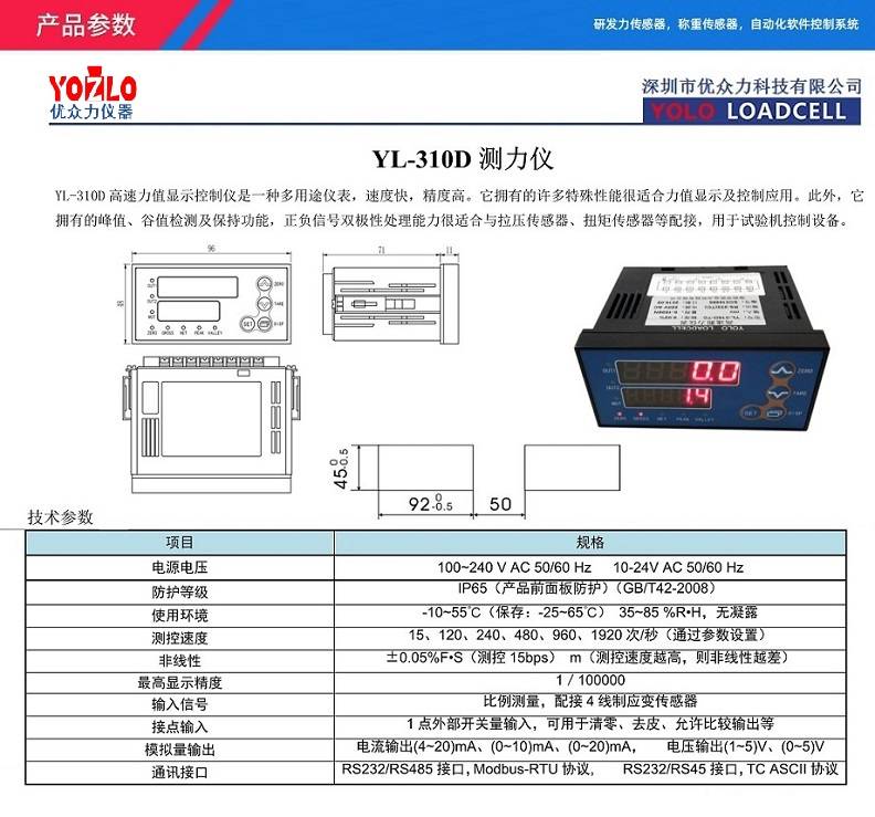 YL-310D 双窗口称重显示仪表 峰值记录 RS45/232输出 力值显示控制仪