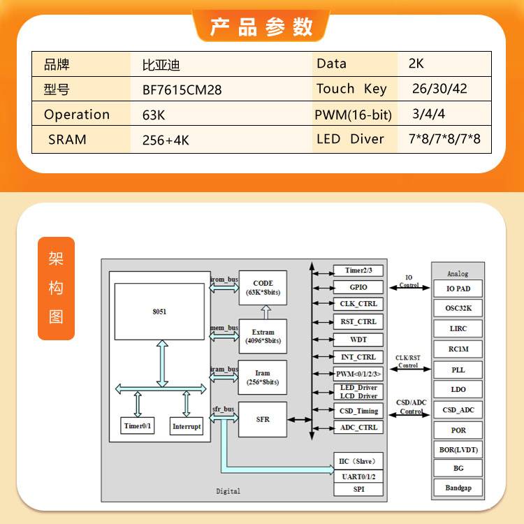 比亚迪代理BF7615CM28触摸芯片CS动态10V测试通过率88%家电MCU