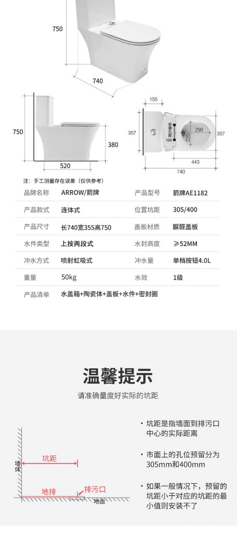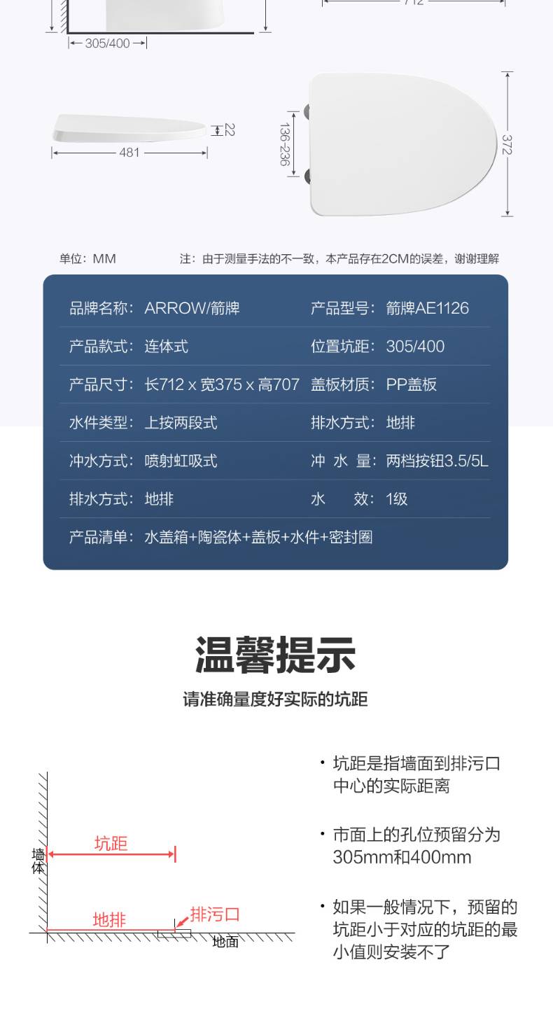 ARROW箭牌卫浴坐便器家用卫生大冲力喷射漩涡虹吸式防臭节水马桶