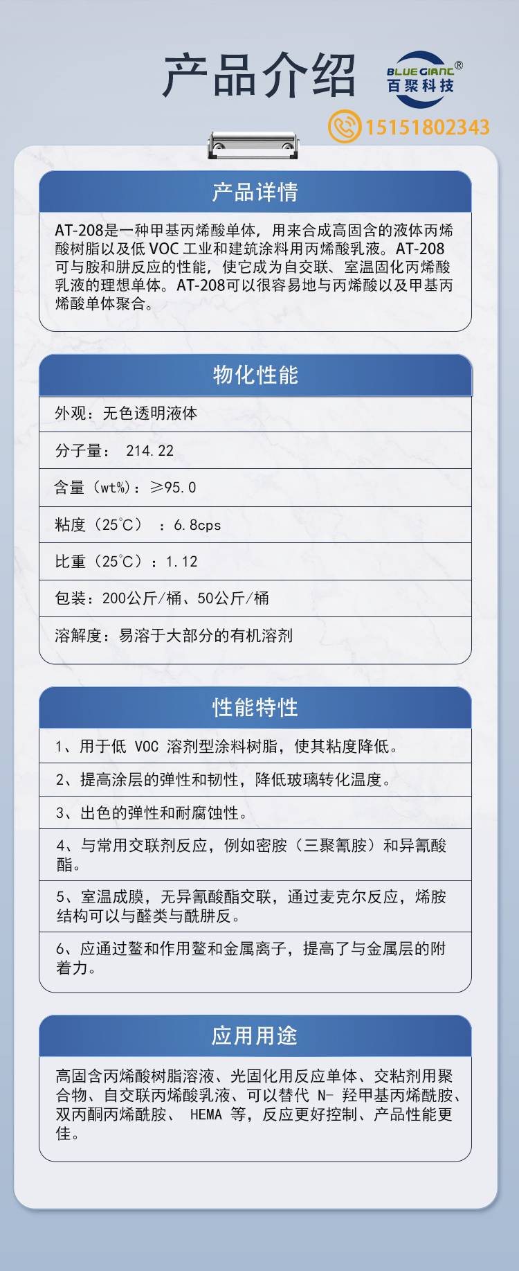AT-208 N-羟甲基丙烯酰胺 交粘剂用聚合物 低VOC溶剂
