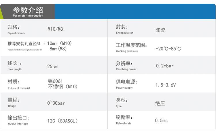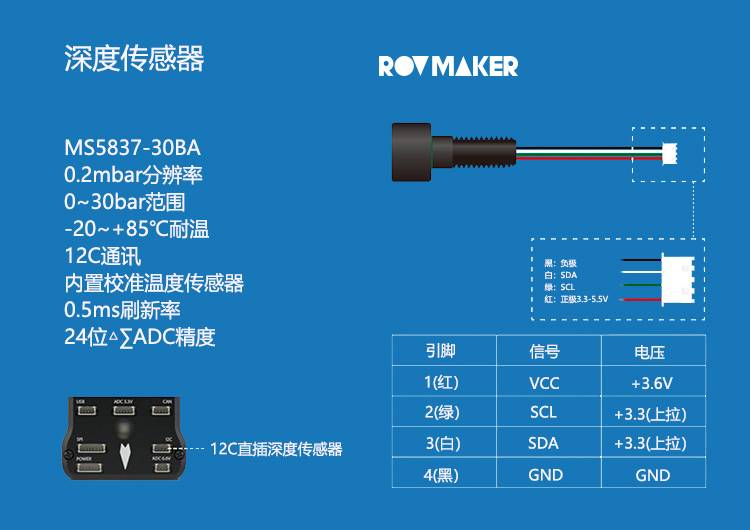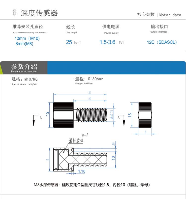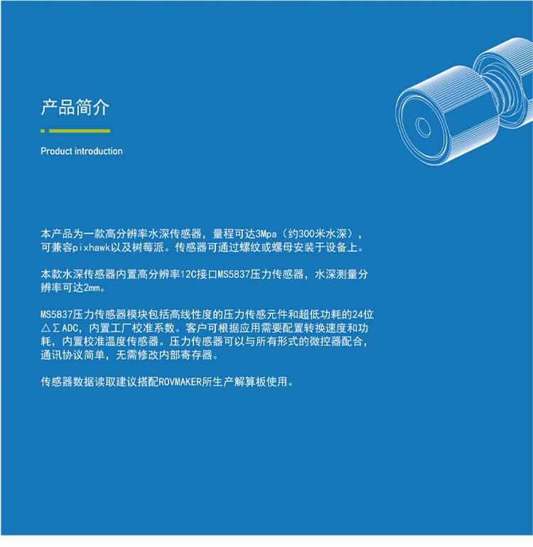 M8 深度传感器 高精度水深传感器 水下机器水压传感器 带温度修正