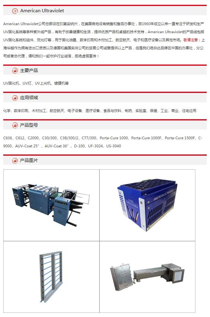原装进口American Ultraviolet UV固化机、UV灯、UV上光机、镀膜机等