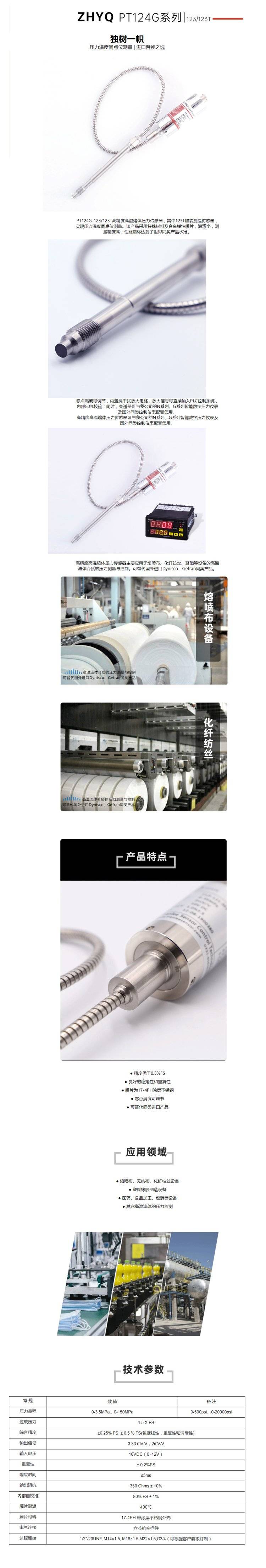 PT124B-123/123T柔性管替代进口型压力变送器,其中123T加装测温传感器,实现压力温度同点位测量。该产品采用特殊材料及合金弹性膜片,温漂小,测量精度高,性能指标达到了世界同类产品水准。同时,变送器可与我公司的N系列、P系列智能数字压力仪表及国外同类控制仪表配套使用。主要应用于化纤纺丝、聚酯等设备的高温流体介质的压力测量与控制。可替代国外进口Dynis-co、Gefran等同类产品。