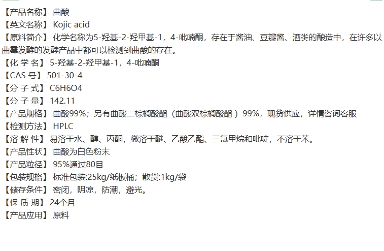 曲酸99% 规格齐全可定制 化妆品级祛斑原料 另有曲酸二棕榈酸酯