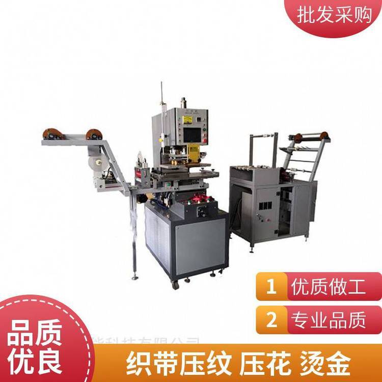 产品介绍:织带压字机,织带压花机,织带压纹机应用范围: 全自动织带压字机,也叫全自动压纹机主要用于尼龙带、PP带、包边带、箱包带、安全带、织带、内衣肩带、弹力带、服装商标等产品表面LOGO压痕加工,同时此机还具备烫金的功能。带有自动进带系统和收带系统,独立稳定的张力控制系统,可实现弹力织带、无