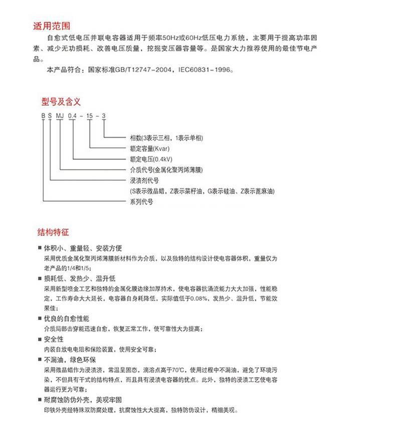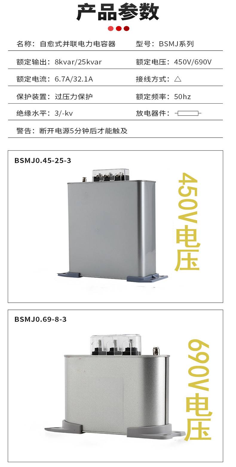 低压自愈式并联电容BSMJ40-0.45-3三相450V干式补偿电容器