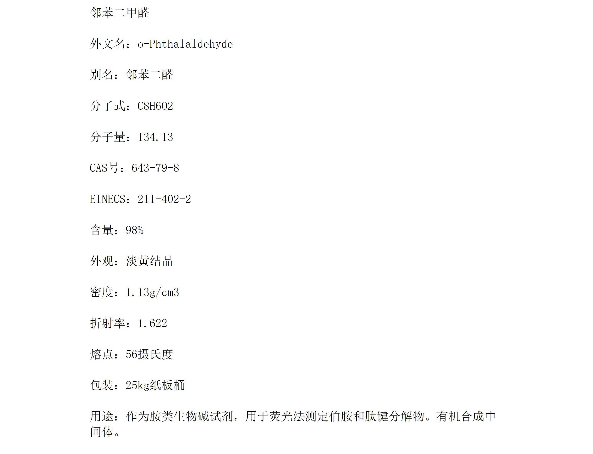 邻苯二甲醛 643-79-8 淡黄结晶 胺类生物碱试剂 有机合成中间体