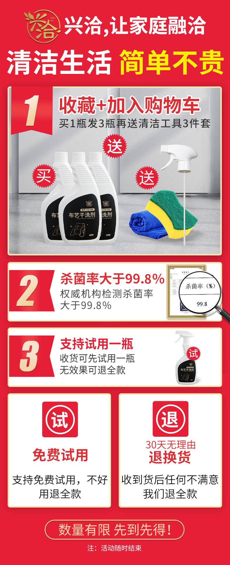 兴洽布艺沙发清洁剂免水洗地毯清洗神器墙布去污干洗污渍清理窗帘