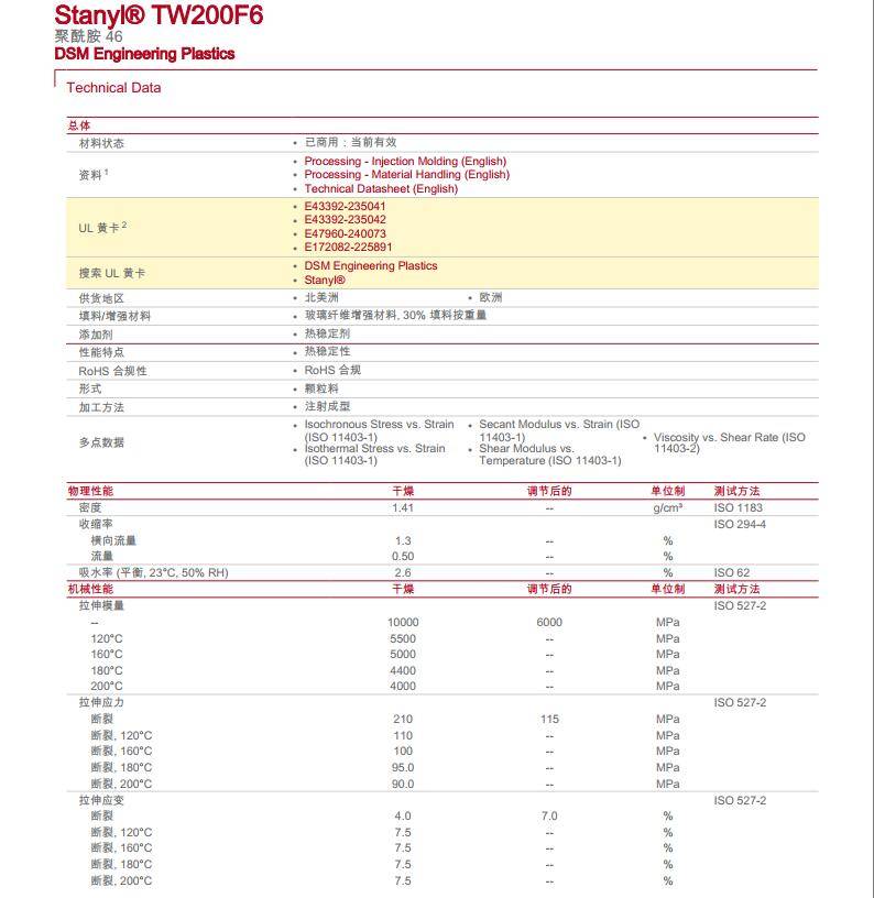 热稳定PA46玻纤30%增强TW200F6树脂 RoHS合规聚酰胺46注射成型