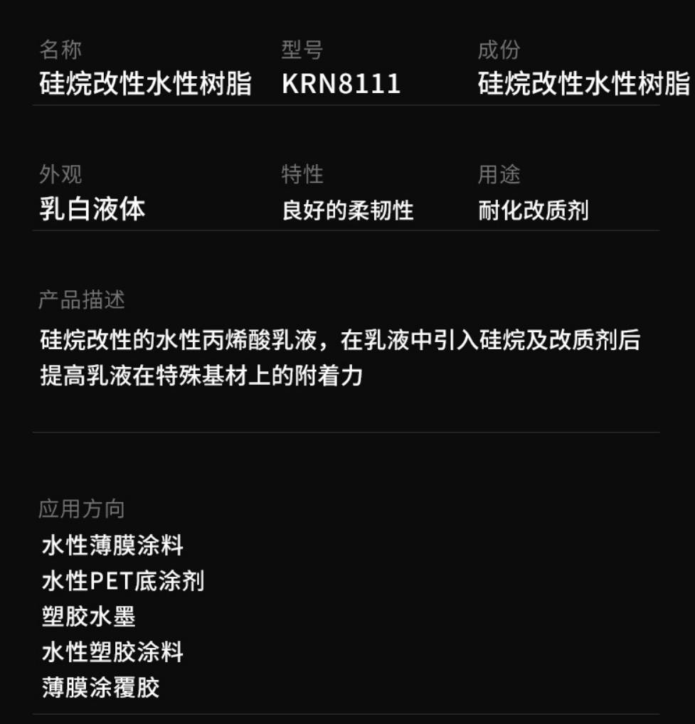 KRN8111硅烷改性水性丙烯酸乳液 抗回粘水 性塑料涂料 金属涂料