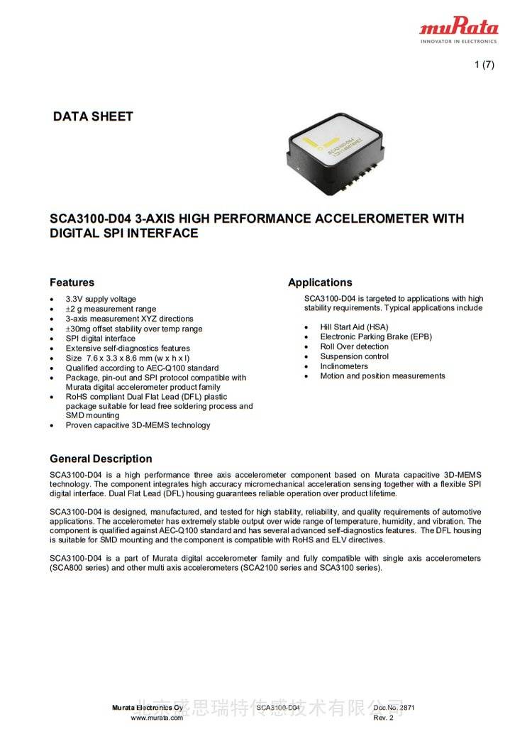 加速度传感器SCA3100SCA3100-D04是基于村田电容式3D MEMS技术的高性能三轴加速度计组件。该组件将高精度微机械加速度传感与灵活的SPI数字接口集成在一起。双扁平引线(DFL)外壳保证了产品寿命内的可靠运行。SCA3100-D04的设计、制造和测试符合汽车应用的高稳定性、可靠性和质量要求。加速度计在宽范围的温度、湿度和振动下