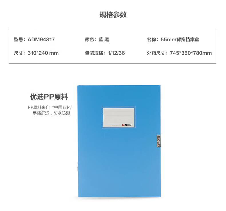 晨光档案盒 A4粘扣文件盒资料盒背宽55mm蓝色 单个装ADM948B