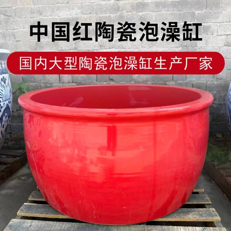 景德镇陶瓷1.2米独立式户外庭院温泉浴缸正宗中国红室外洗澡落地泡澡缸