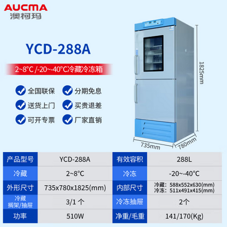 Aucma澳柯玛商用冷藏冷冻冰箱YCD-288实验室双温立式疫苗储存箱柜