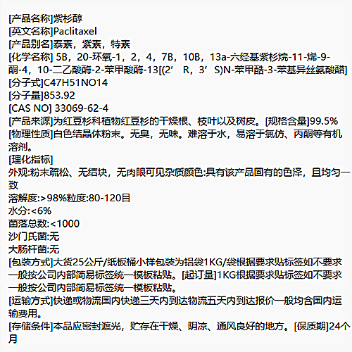 紫杉醇 红豆杉提取物 Paclitaxel 33069-62-4 1公斤装