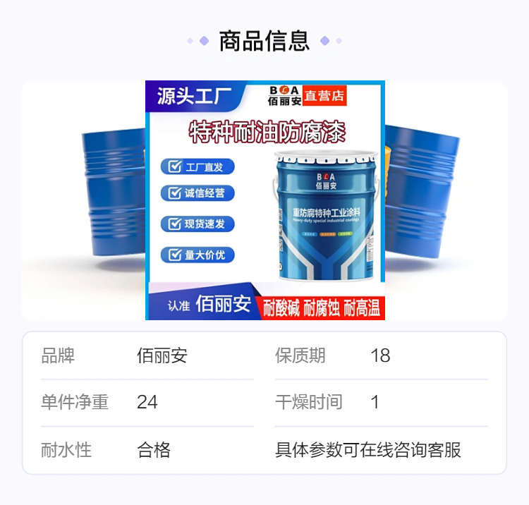 佰丽安耐酸碱防腐漆地沟油储罐专用防锈涂料耐油水钢结构防腐油漆