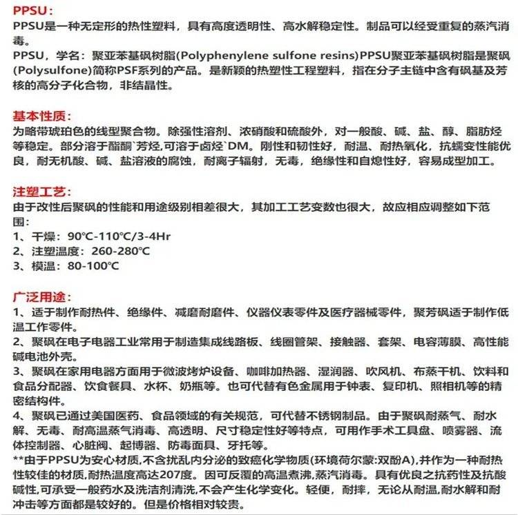 PPSU聚亚苯基砜树脂是聚砜(Polysulfone)简称PSF系列的产品 。是新颖的热塑性工程塑料,指在分子主链中含有砜基及芳核的高分子化合物,非结晶性。