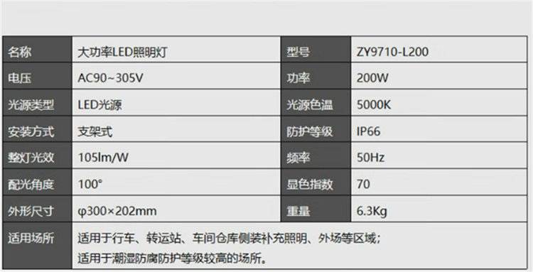 ZY9710-L200LED照明灯厂房车间仓库港口码头场馆投光灯具200W