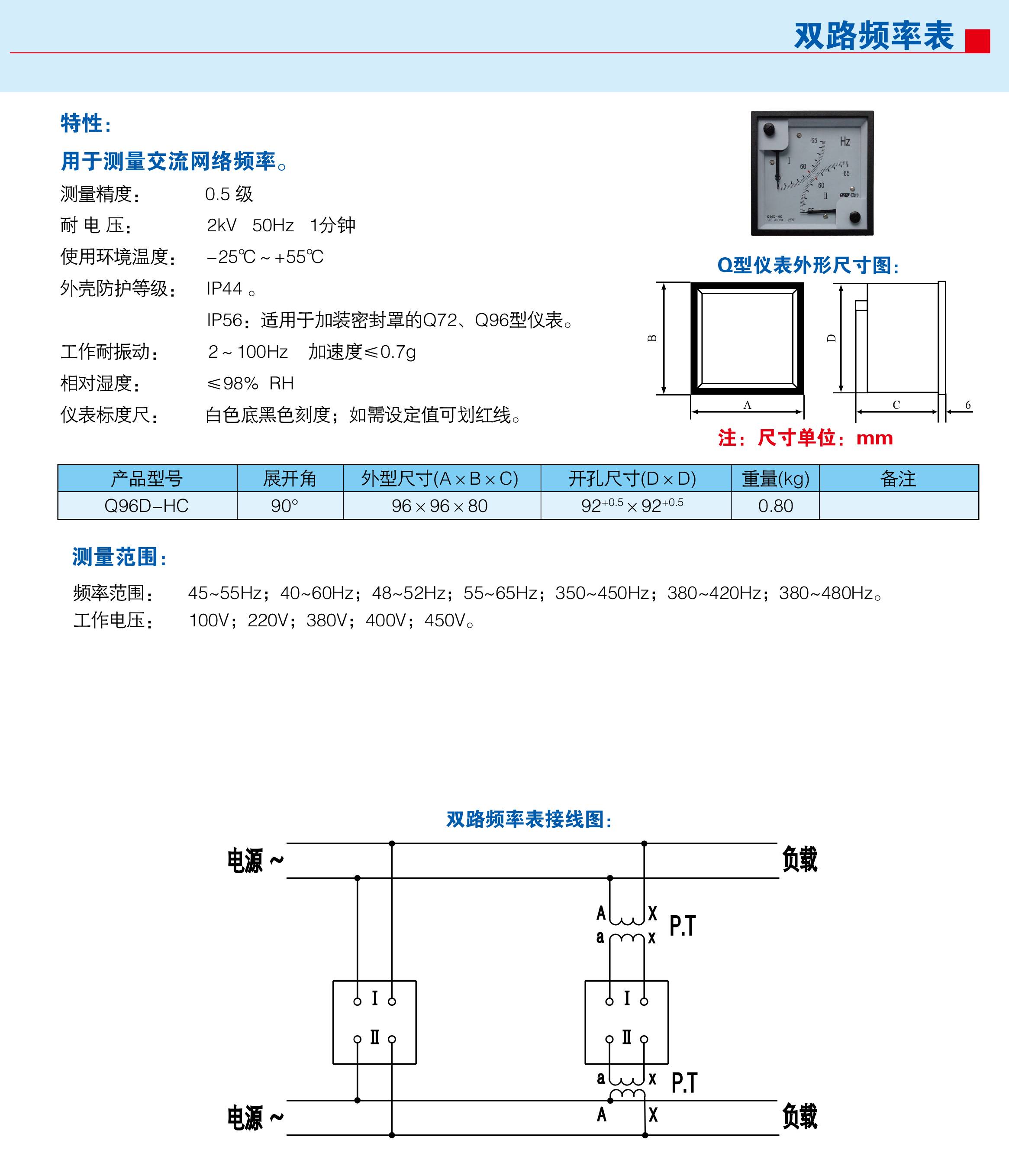 上自仪自一船用仪表厂Q96D-HC双路频率表用于测量交流网络