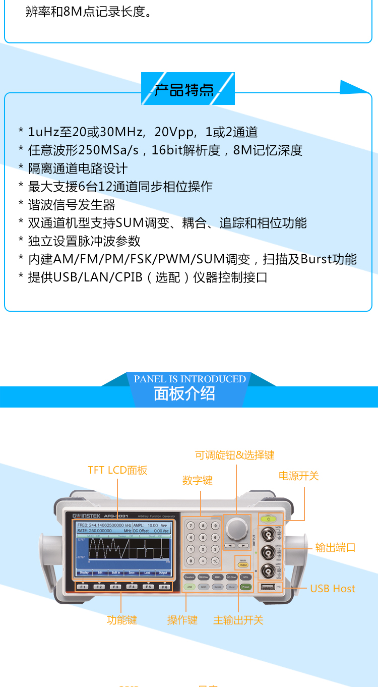 固纬电子推出最新的AFG-3000系列分别为20MHz/30MHz单隔离信道及双隔离信道的任意波形信号产生器,适用于工业,科学研究及教育领域。在隔离式输出的设计中,所有输出通道接地与大地是隔离的,适用在浮动电路的测试应用中,例如与电源供应器的 DC 电压串接后,直流加交流的输出最高可达到+42V 或-42V。而且双通道可以各自独立使用或多台仪器同时输出使用而无需考虑接地参考的问题,例如车用电子的发动机控制器或传动装置等等。它们提供250 MSa/s取样率、16位分辨率、8 M点内存深度的任意波形特性。除了将预先编辑好的波形档案下载到内存中,产生任意波形以外,用户还可利用 AFG-3000 系列内建的 DSOLink 功能,将固纬电子数字示波器所量到的信号复制产生出来。