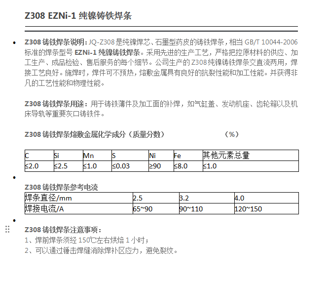 Z308 EZNi-1纯镍铸铁焊条 用于铸铁薄件及加工面的补焊 如气缸盖