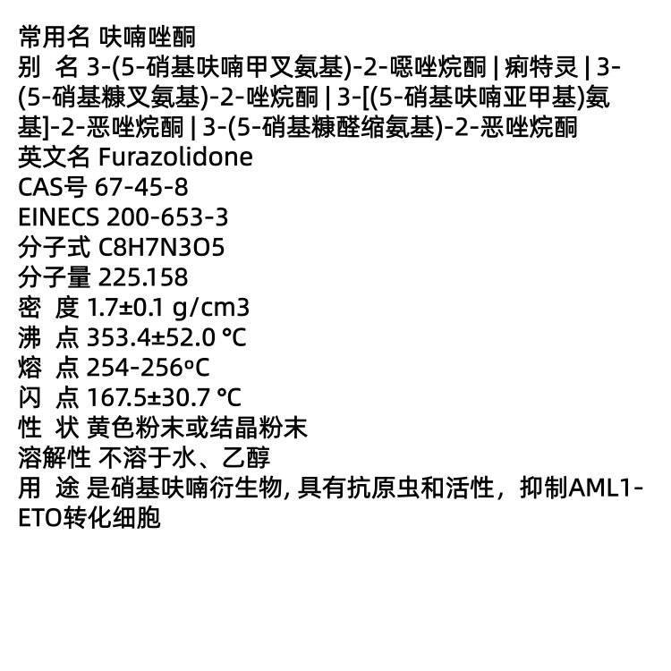 呋喃唑酮 3-(5-硝基呋喃甲叉氨基)-2-噁唑烷酮 67-45-8 硝基呋喃衍生物 抗原虫和活性 抑制AML1-ETO转化细胞 全国可发