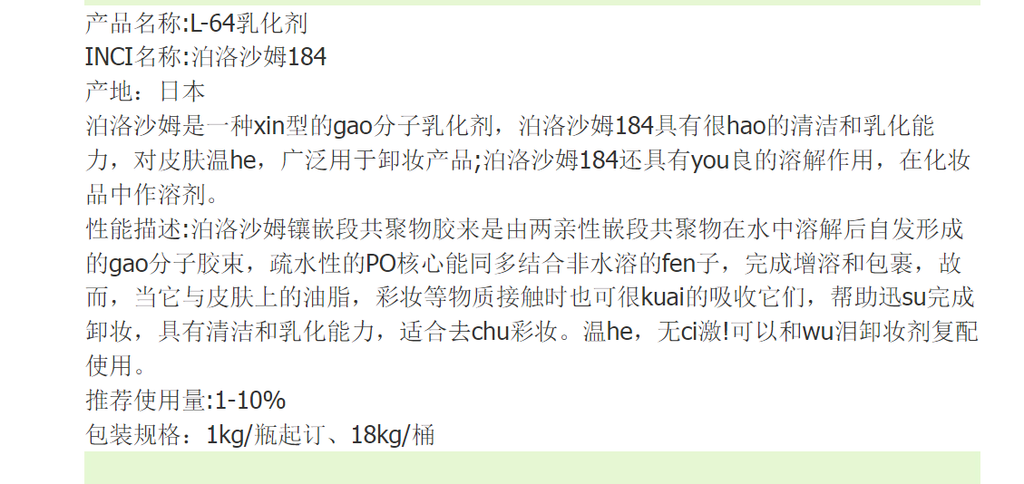 日本 L-64 乳化剂 泊洛沙姆184 卸妆水洁面乳 原料 1kg
