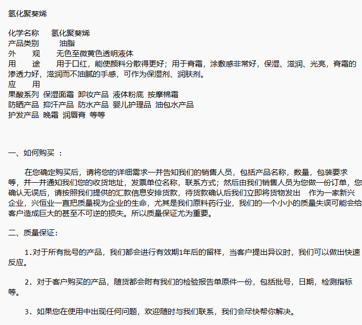 氢化聚葵烯 用于膏霜可作为保湿剂和 卸妆产品 等 99%