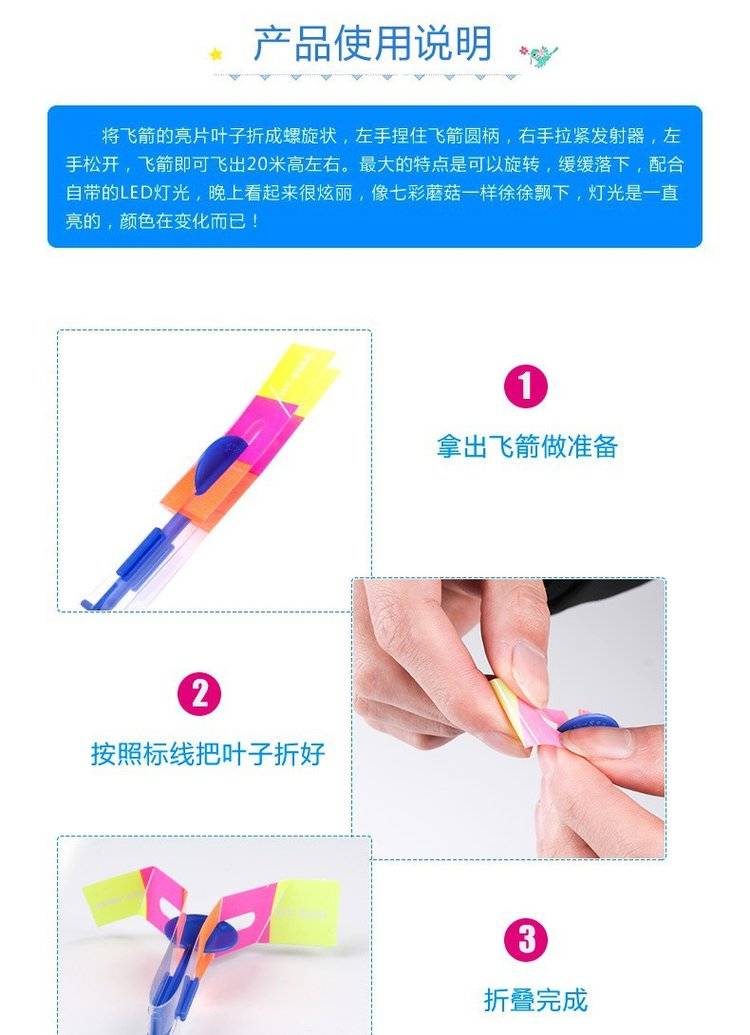 1.拿出飞箭做准备2.按照标线把叶子折叠好3.折叠完成