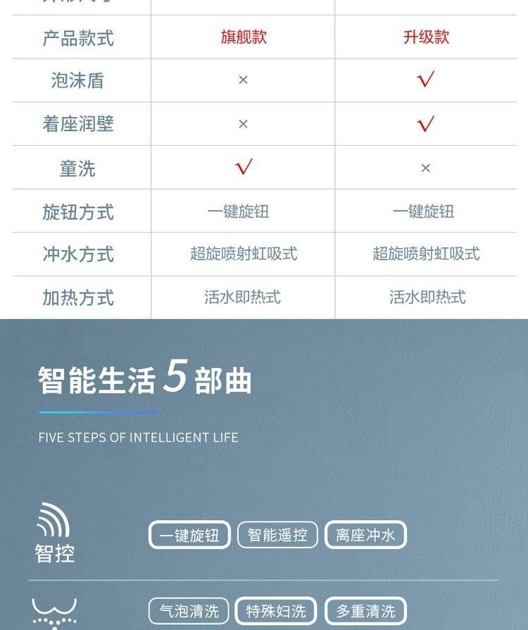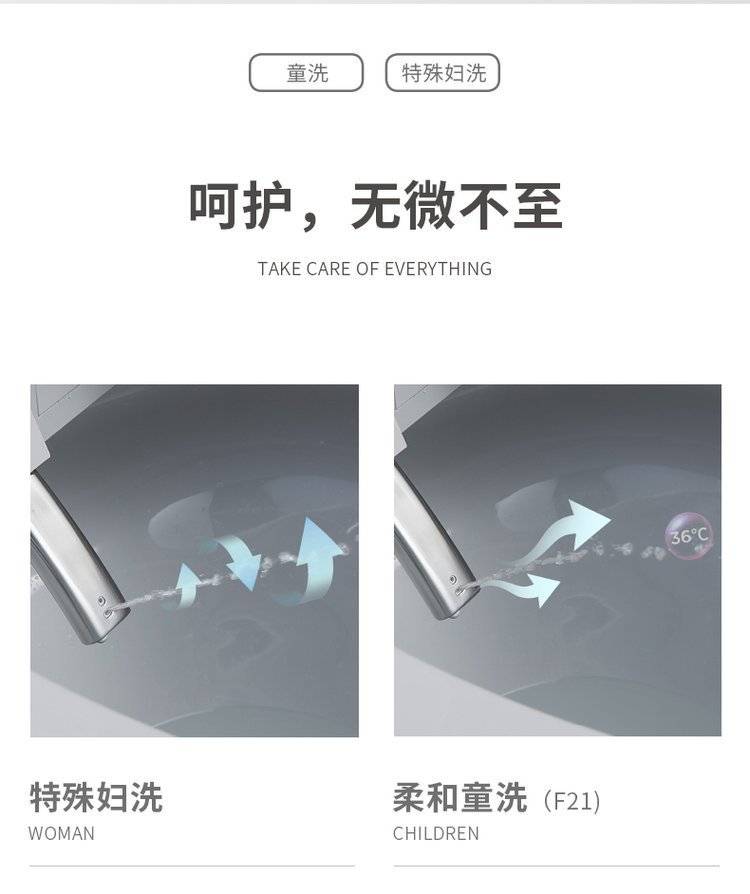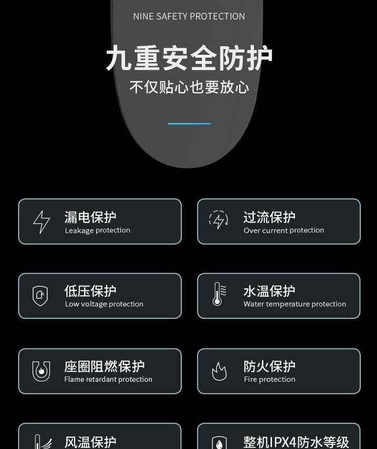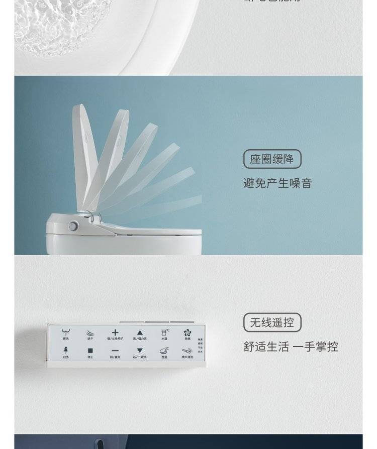 活水即热、智洁喷射、虹吸、高温自洁釉、米暖风烘干、抗菌加热座圈、智能除臭、智享座圈缓降、夜光照明、漏电保护、过流保护、低压保护、水温保护、座圈阻燃保护