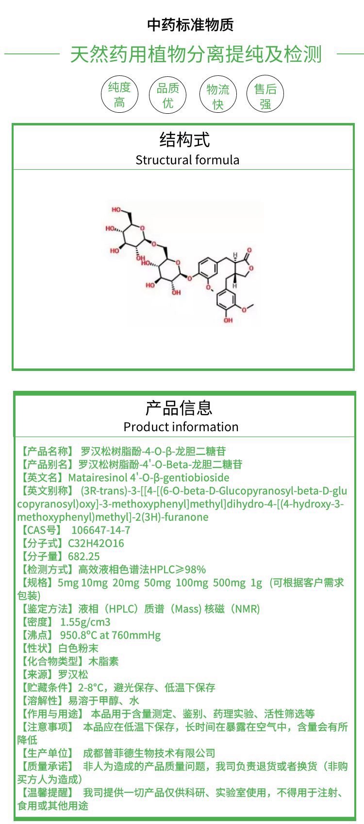 罗汉松树脂酚-4-O-β-龙胆二糖苷 106647-14-7 对照品 HPLC≥98%