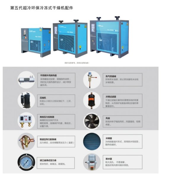 空气中的水蒸气含量,而多余的水蒸气会凝结成液体,冷冻式干燥机就是根据水的饱合蒸汽压力和温度之间的对应关系;利用制冷装置使压缩空气冷却到一定的露点温度,析出所含的水份,通过气水分离器与电动排水器将水排出,从而使压缩空气得到干燥。风冷式高温型冷冻式干燥机的制冷散热装置是风冷式冷凝器。