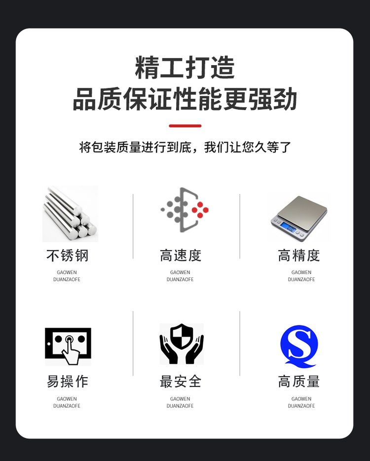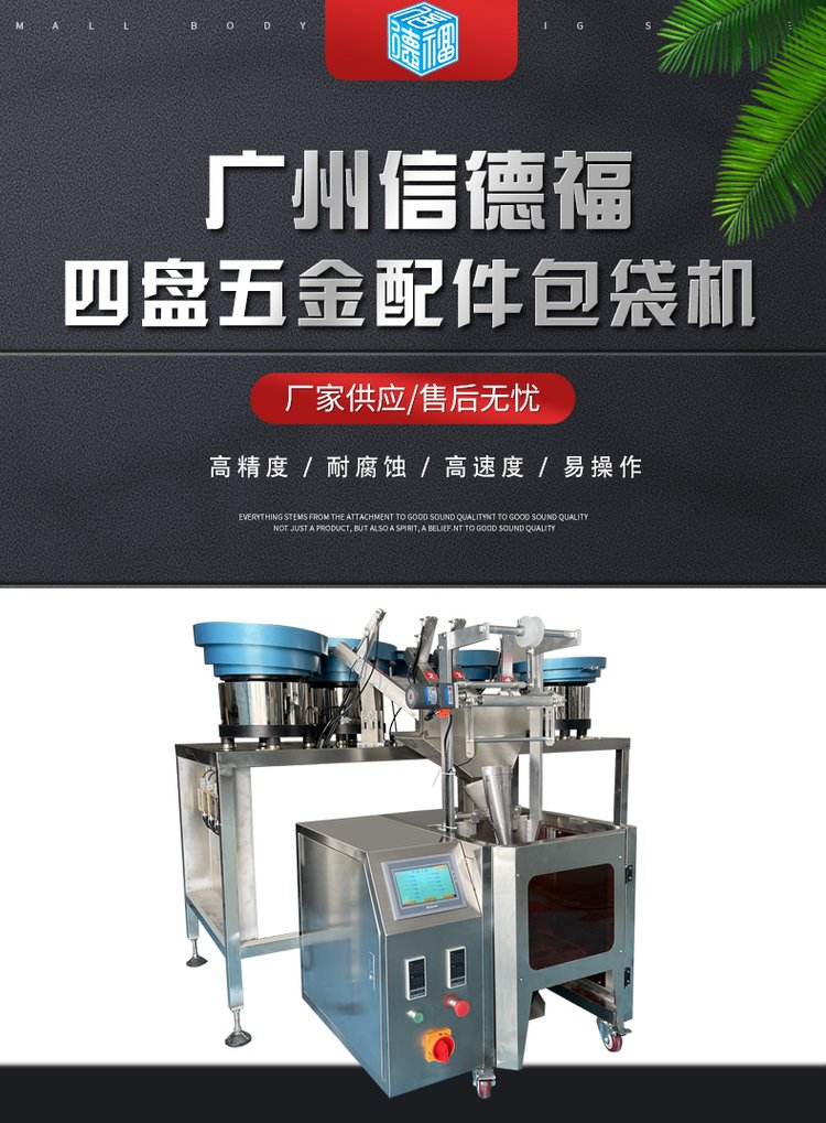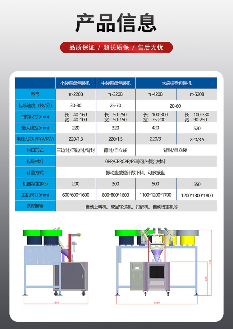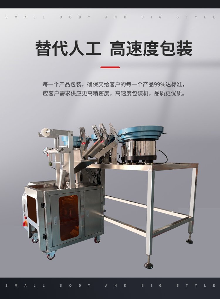 一、产品简介:适用范围:该机适用于家具、电器、电子、灯饰、卫浴、玩具、汽配及一些特殊行业产品中的附属安装螺丝、螺母、小塑胶件的单种物料的计数包装,如:螺母、螺丝、铁钉、垫片、积木等特殊物料的自动包装二、产品特点:1、多功能:振盘包装机可自动完成计数、制袋、充填、封合、打印批号、切断及计数等全部工作;2、采用日本三菱进口PLC控制,台湾进口触摸屏操作,控制系统性能稳定、优越,且常规操作均能通过触摸屏一键完成(如:袋子尺寸、成品数量、包装速度等);台湾亚德客气缸驱动,动作稳定三、技术性能:1、完美制袋:自动计数光电系统,便捷的程序设定模式、光电跟踪色标、主动力模式气动,设备更加节能,更加稳定2、振动盘:针对螺丝/异型件等样品量身定做的振动盘,铝制底盘,多频控制器保证振动盘平稳、有力运行,振动盘的排料设计能够有效针对不同物料进行排料,保证物料有序的排出,大限度的保证不卡料、不堵料;3、零误差:采用震动盘供料,机械计数,定位计量,同时采用光学技术,保证成品零误差4、故障自检:每个振动盘装有料满停机、缺料报警或停机装置。设备具有自诊断功能,当出现故障后能够自动报警或者停机(报警或者停机用户可选),装有报警提示灯和声音系统,快速警示操作人员。