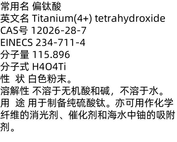 用于制备纯硫酸钛。亦可用作化学纤维的消光剂、催化剂和海水中铀的吸附剂。
