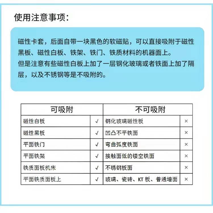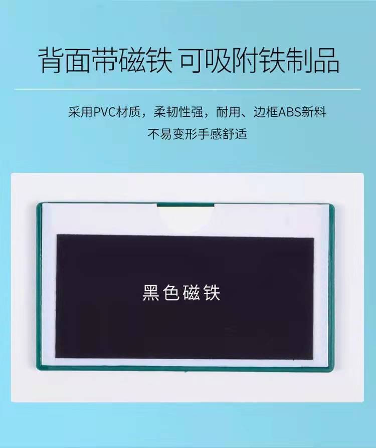 磁性标签的概念是现代仓库管理中标签的一种,又叫磁性标牌、磁标签、材料卡、货位卡,由ABS工程塑料制成,是一种靠磁性吸附在文档架、书架、货架上标示该处物品信息的材料卡,其正面为物品信息标明面,背面是薄片方块关磁铁。常用于商场、文档室、图书馆、仓库等场所内。磁性标签按用途可分为普通型和计数器型两种。