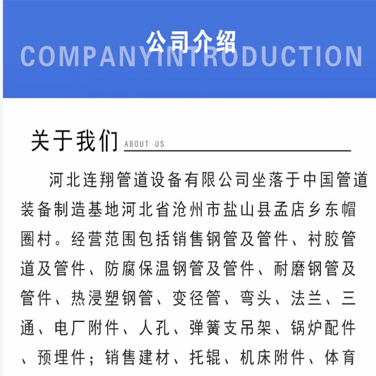 销售钢管及管件,衬胶管道及管件,防腐保温钢管及管件,耐磨钢管及管件,热浸塑钢管,变径管,弯头,法兰,三通,电厂附件,人孔,弹簧支吊架,锅炉配件,预埋件,销售建材,托辊,机床附件,体育器材
