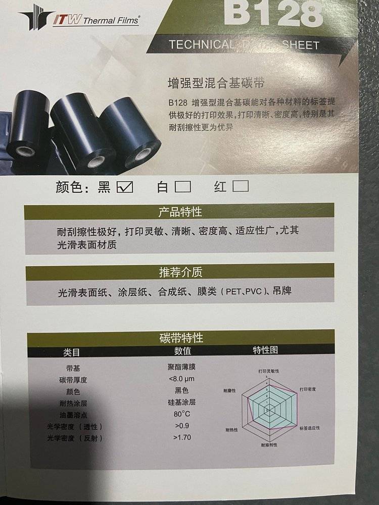 ITW依工B128增强混合型碳带 物料标签防刮色带打印铜版纸