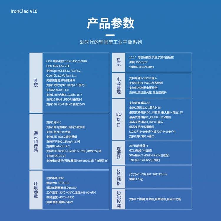 10.1寸 IronClad V10车载平板1024*600 1000cd/㎡高端坚固型工业平板