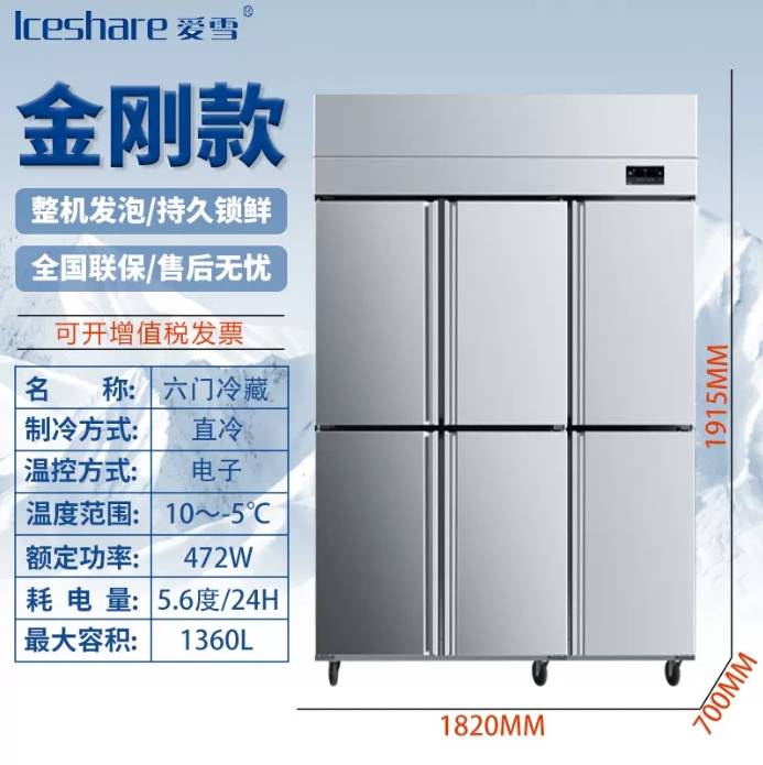 供应爱雪六门冷藏柜 厨房不锈钢商用冷藏保鲜柜 大容量