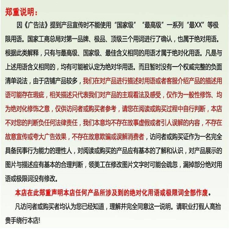 特别提示:商品详情页中(含主图)以文字或者图片形式标注的抢购价等价格可能是在特定活动时段下的价格,商品的具体价格以订单结算页价格为准或言是您与商家联系后协商达成的实际成交价格为准;如您发现活动商品价格或活动信息有异常,建议购买前先咨询商家。