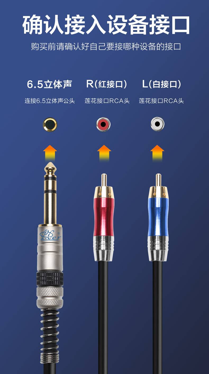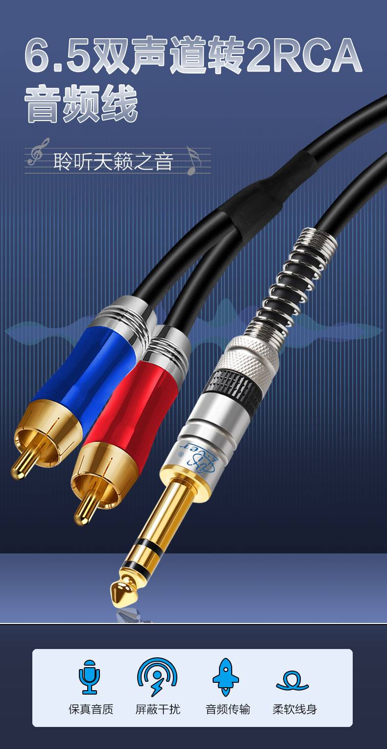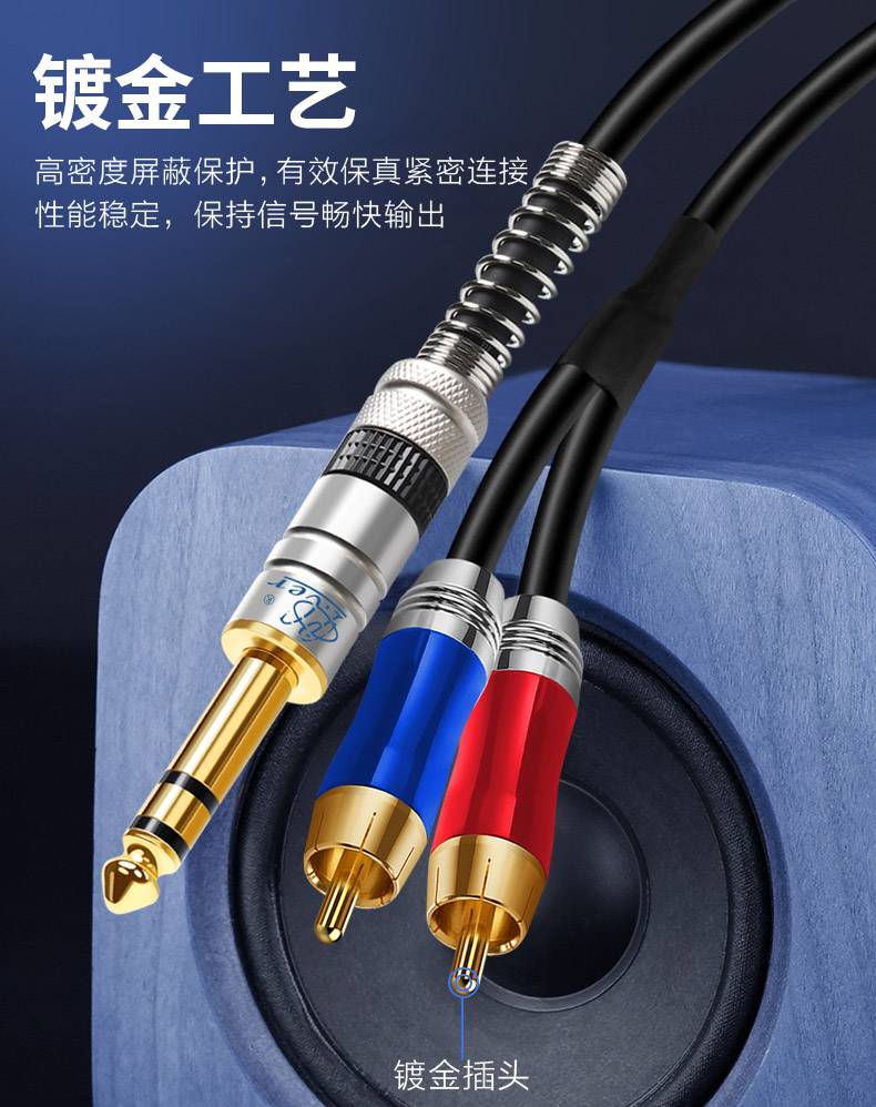 征途者双声道6.5mm转双莲花音频线 大三芯AV调音台功放音箱连接线