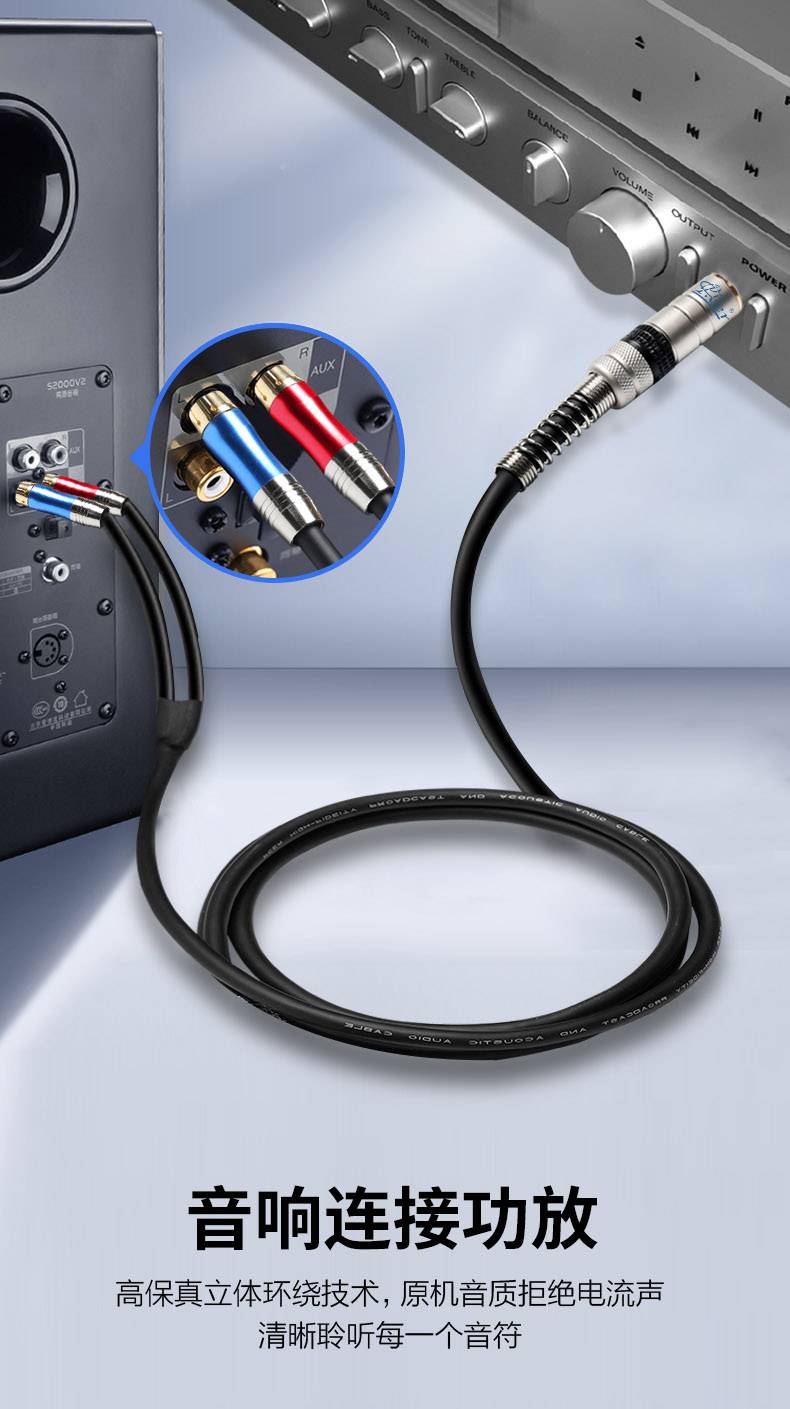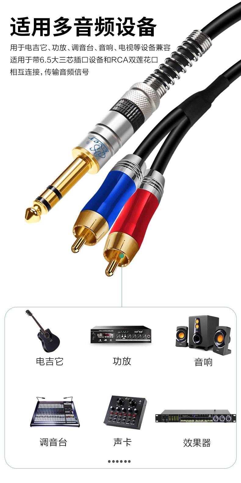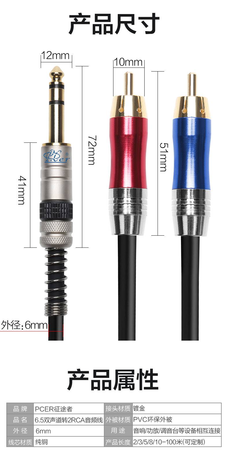 征途者双声道6.5mm转双莲花音频线 大三芯AV调音台功放音箱连接线