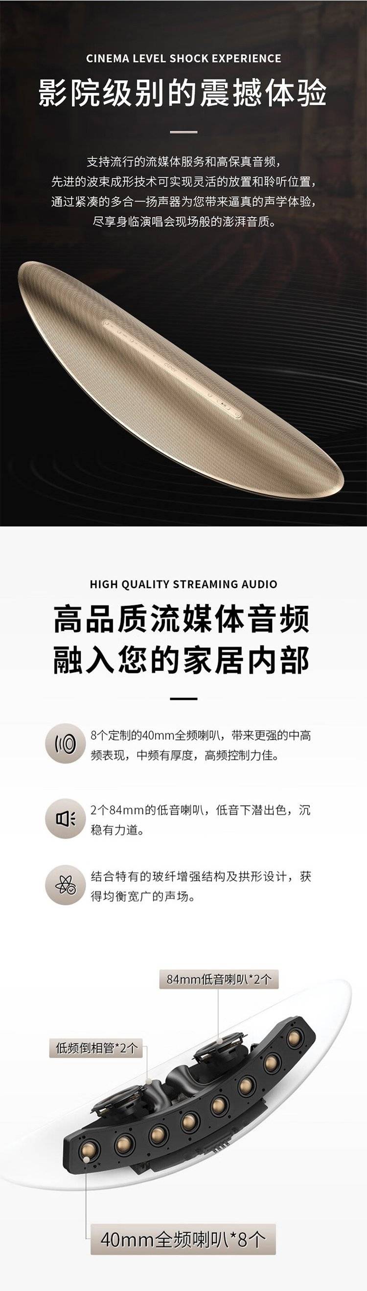 8个40mm全频喇叭,额定功率8W*8;2个84mm低音喇叭,额定功率25W2