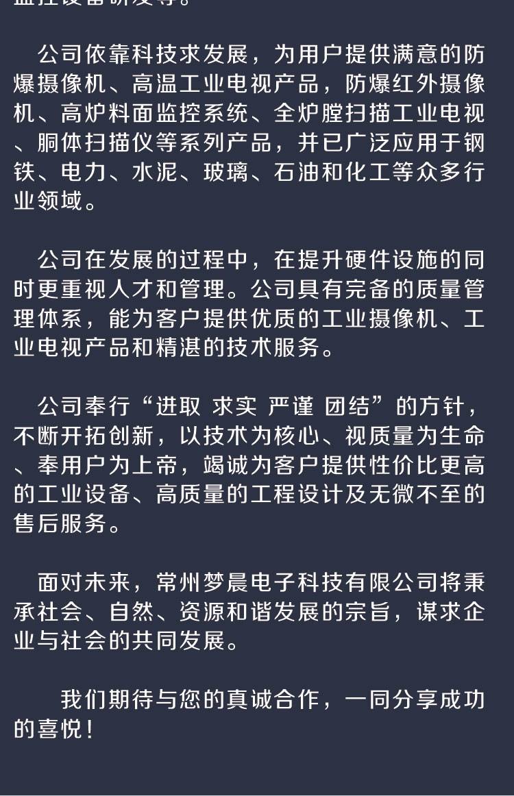 电子元器件,电器设备研发,制造,工业自动化设备,语音广播系统设备,高温工业监控,视频监控设备,防爆产品,通信产品的制造,加工,销售,安防工程施工及相关设备的销售,安装,调试,维护