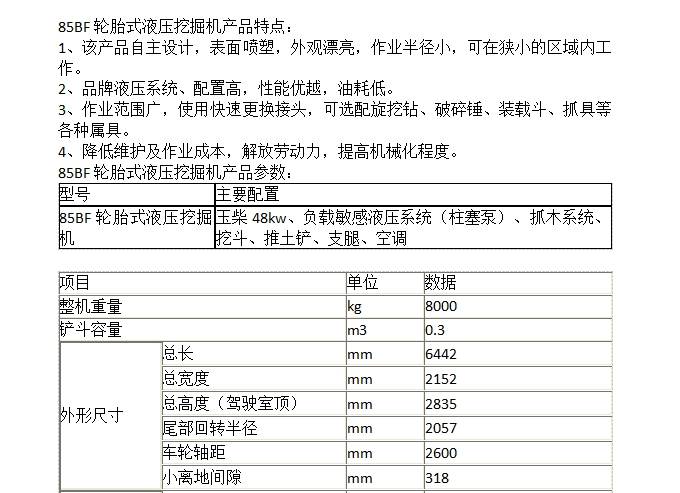 85BF轮胎式液压挖掘机 作业半径小 使用范围广