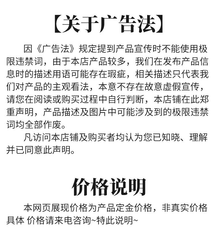 特别提示:商品详情页中(含主图)以文字或者图片形式标注的抢购价等价格可能是在特定活动时段下的价格,商品的具体价格以订单结算页价格为准或言是您与商家联系后协商达成的实际成交价格为准;如您发现活动商品价格或活动信息有异常,建议购买前先咨询商家。