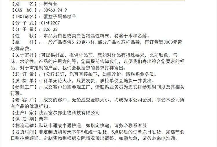 富予邦生物 树莓苷98% 化妆品级 树莓提取物 覆盆子酮葡糖苷