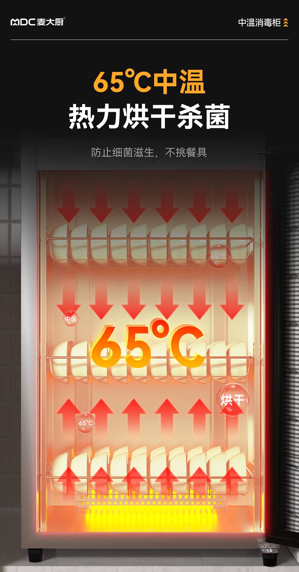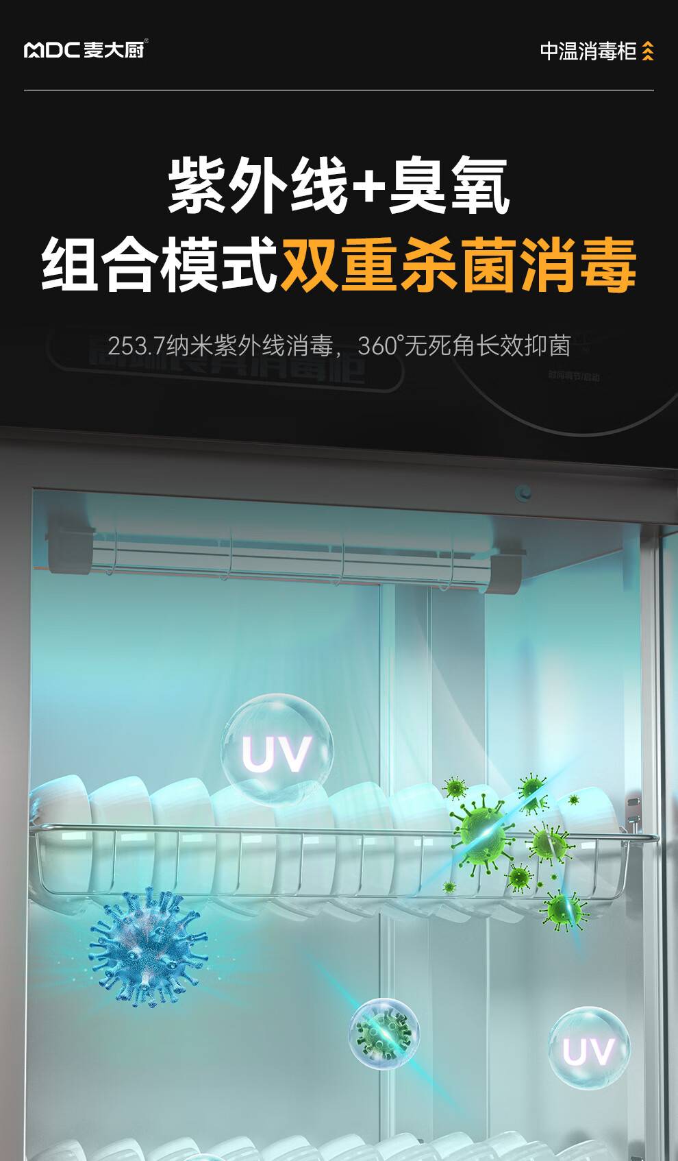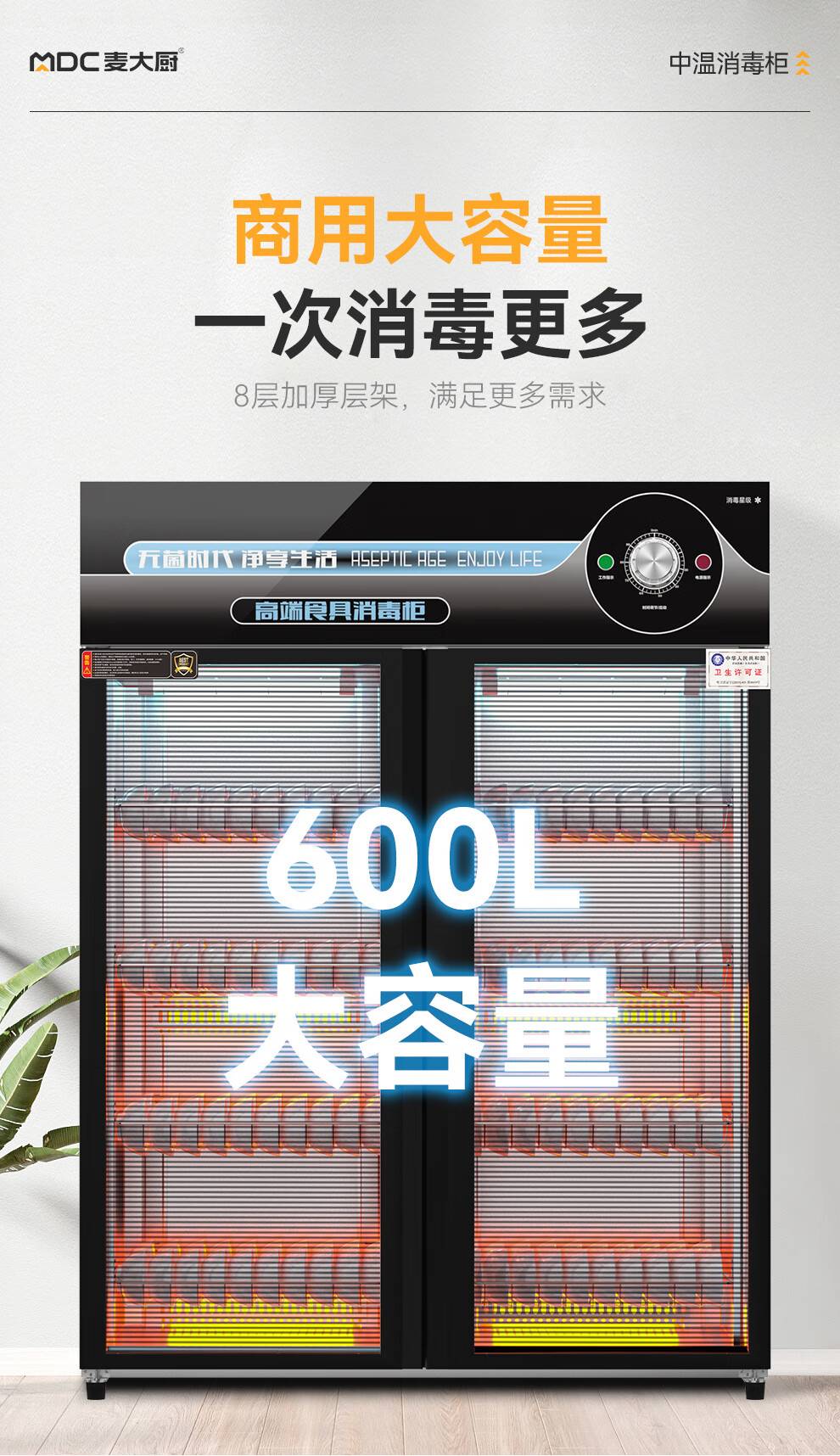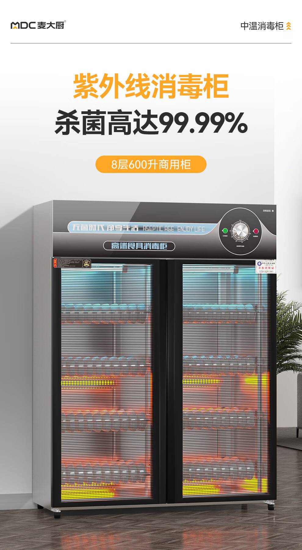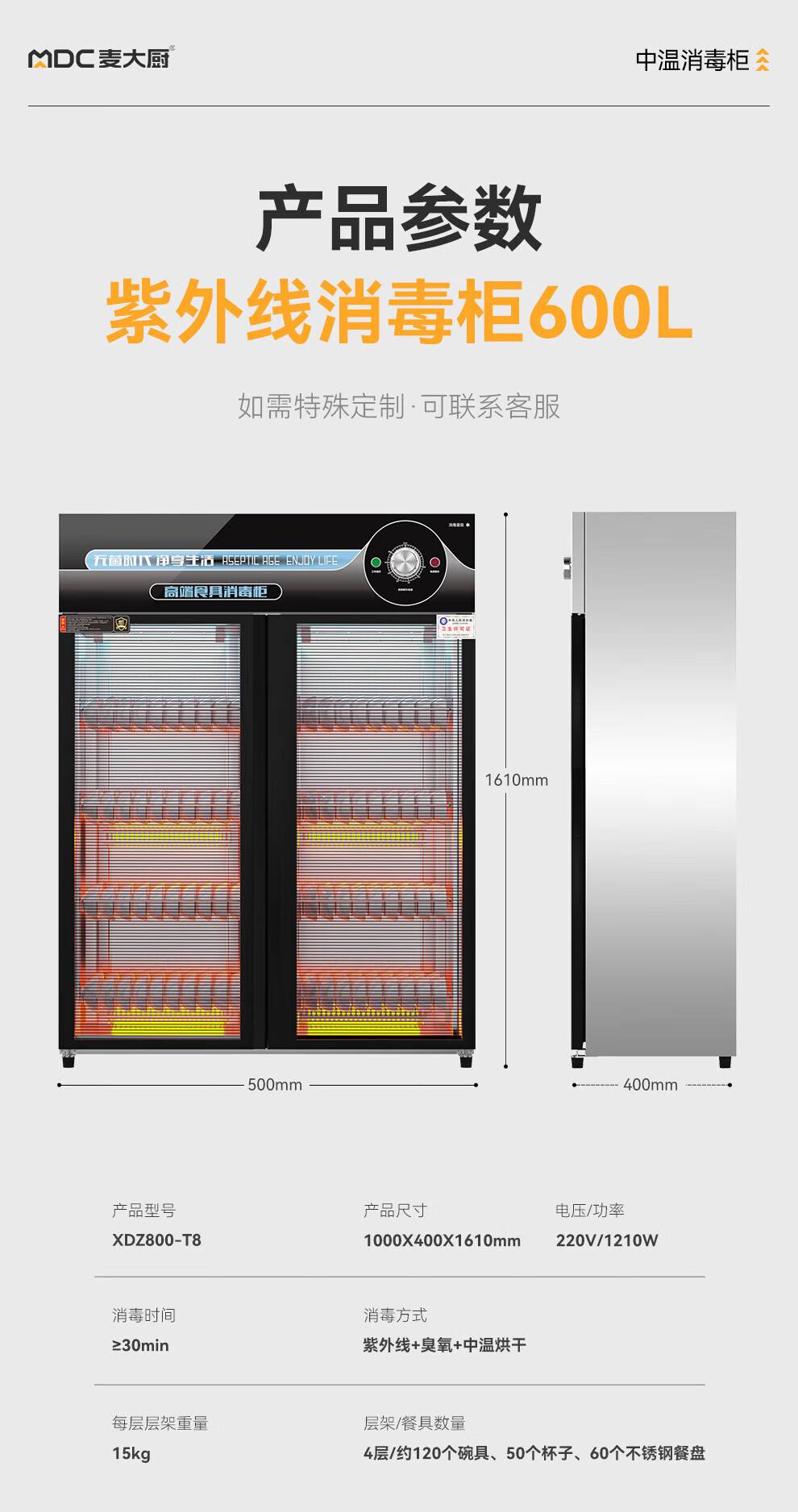 麦大厨高端旋钮款610W单门600L中温玻璃食具紫外线消毒柜